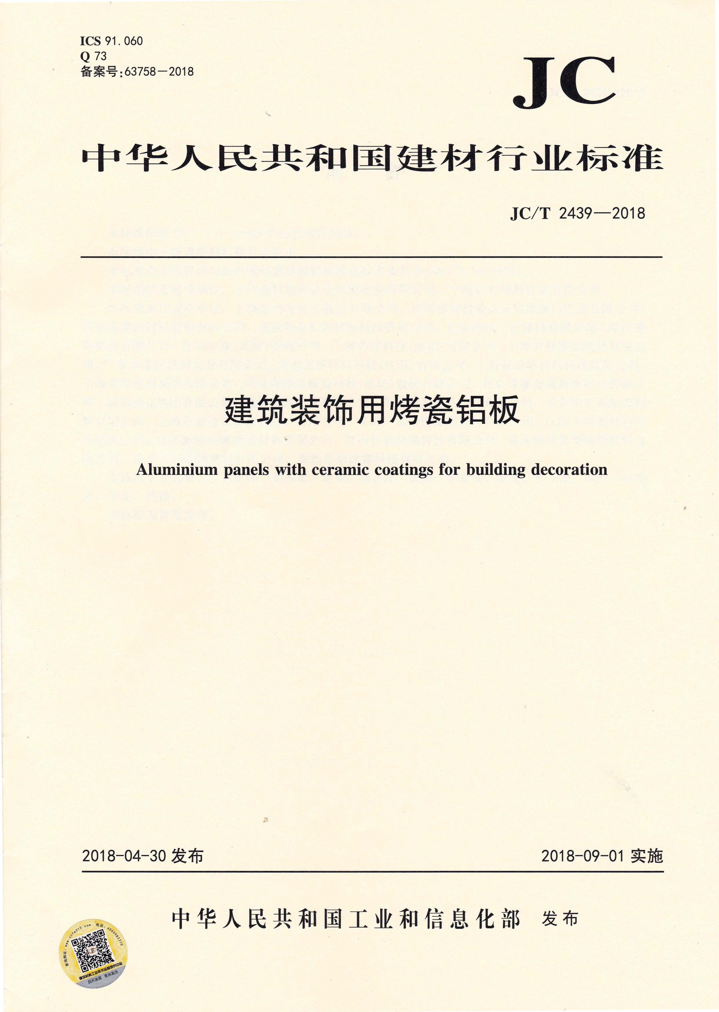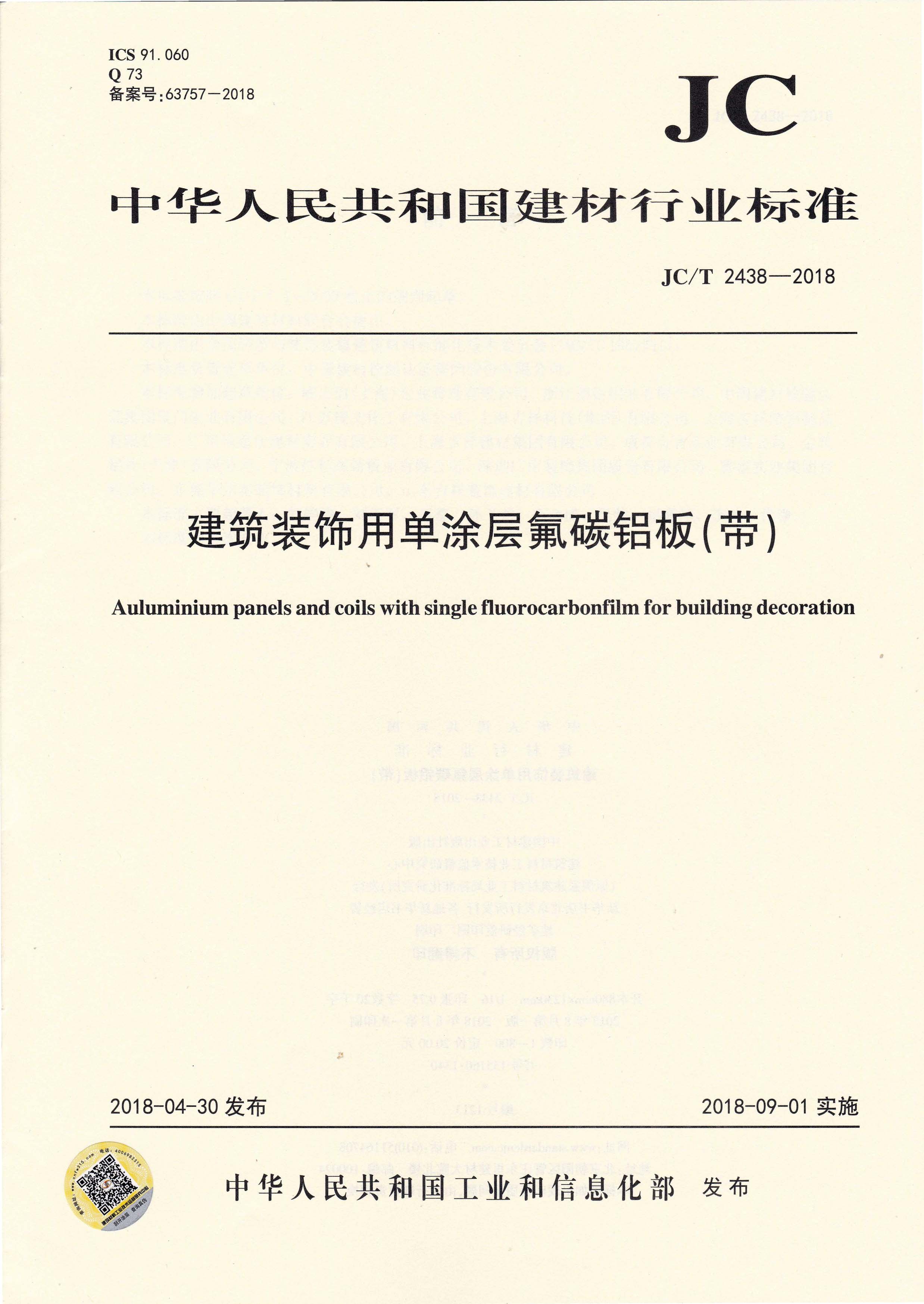 近日,由中國建筑材料聯(lián)合會提出,雅泰實業(yè)集團有限公司參與起草的JC/T 2439-2018《建筑裝飾用烤瓷鋁板》、JC/T 2438-2018《建筑裝飾用單涂層氟碳鋁板(帶)》兩項行業(yè)標準于2018年4月30日首次發(fā)布,2018年9月1日起正式實施。