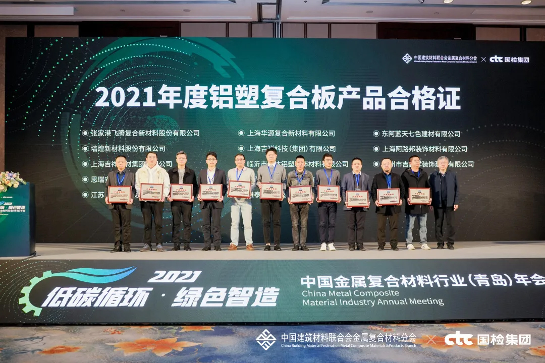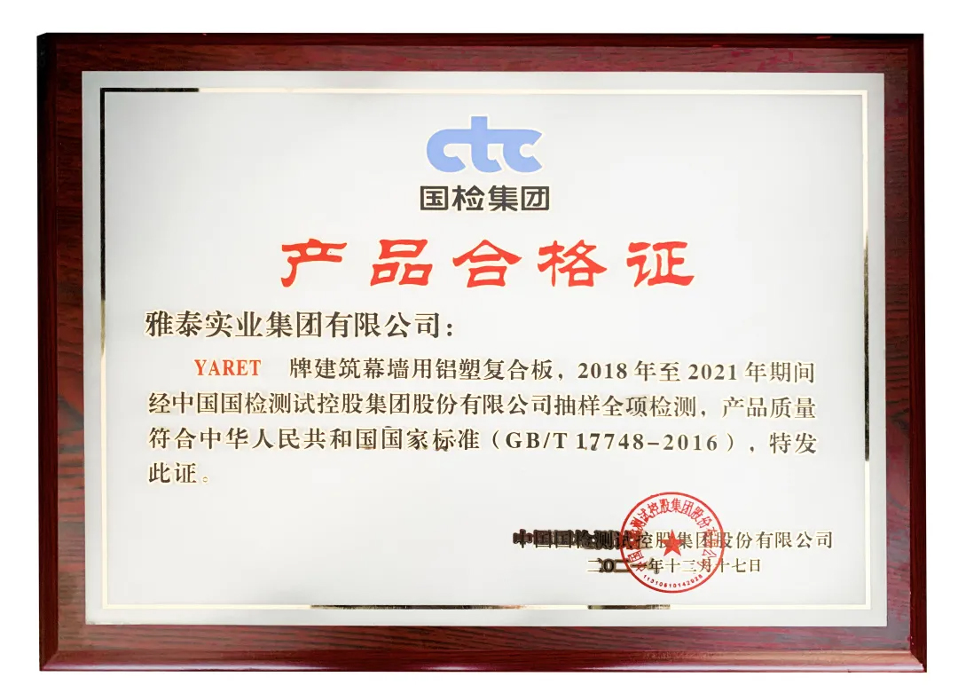 會(huì)上,對(duì)2021年度行業(yè)優(yōu)秀的產(chǎn)品與企業(yè)進(jìn)行了表彰頒獎(jiǎng)——雅泰 YARET 牌鋁塑復(fù)合板,于2018年至2021年期間經(jīng)中國建材檢驗(yàn)認(rèn)證集團(tuán)股份有限公司抽樣全項(xiàng)檢測(cè),產(chǎn)品質(zhì)量符合中華人民共和國國家標(biāo)準(zhǔn)(GB/T 17748-2016),榮獲2021年度CTC認(rèn)證產(chǎn)品合格證。