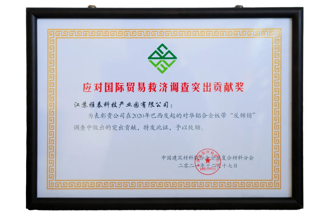 2021年,受各種不可抗力因素影響,國際市場(chǎng)貿(mào)易摩擦不斷,雅泰外貿(mào)形勢(shì)略為嚴(yán)峻,但雅泰通過強(qiáng)大的國家背書,尋求各方支持幫助、積極應(yīng)對(duì),成功打贏反傾銷一案,大會(huì)特別頒發(fā) “應(yīng)對(duì)國際貿(mào)易救濟(jì)調(diào)查突出貢獻(xiàn)獎(jiǎng)” 。
